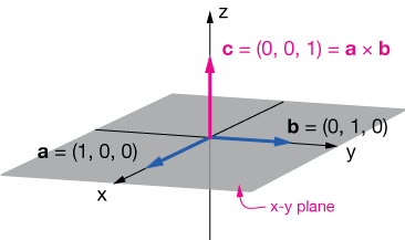 $$ \begin{align} \vec{x} &\times \vec{y} \\[5pt] &= [0(0) - 1(0)]x + [0(0)- 1(0)]y + [1(1) - 0(0)]z \\[5pt] &= (0, 0, 1) = \vec{z} \end{align}$$