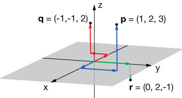 First we need to find two vectors in that plane. We can do that by subtracting the components of one vector (let's choose p) from the other two. That will give us two vectors with the same origin. Here are our three points plotted on a 3-D Cartesian grid: