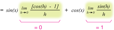 $$ = \lim_{h\to 0} \frac{\text{sin}(x)[\text{cos}(h) - 1]}{h} + \lim_{h\to 0} \frac{\text{cos}(x)\text{sin}(h)}{h}$$