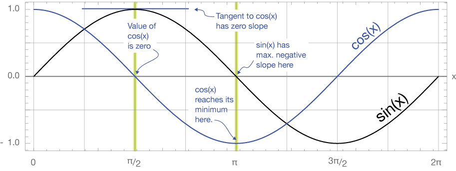 Take a minute to look at the graph below and see if you can rationalize why cos(x) should be the derivative of $\text{sin}(x)$. Notice that wherever $\text{sin}(x)$ has a maximum or minimum (at which point the slope of a tangent line would be zero), the value of the cosine function is zero. Notice that wherever $\text{sin}(x)$ has maximum slope (where it passes through y=0), the cosine function reaches its minimum or maximum at ±1.