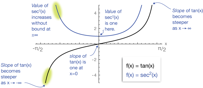 Use the graph below to understand why $\text{sec}^2(x)$ gives the slope of $\text{tan}(x)$ at any point between ±$\pi$/2 (remember that the tangent function is infinite at multiples of ±$\pi/2$). Notice that the slope of the tangent function is always positive, and the value of the derivative is always positive, too.