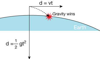 Look at the scenario above. If you throw the ball parallel to the surface (Earth is big – it seems flat to us) at a velocity that produces some forward distance in a given time (let's say a second) that does not keep up with the downward distance caused by the pull of gravity, the ball will eventuall land.