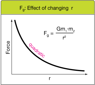 The important thing about this feature of gravity is that if we double the distance between objects, the force of gravity is reduced by a factor of four ($2^2$), not two. The graph shows that when r, the distance between masses, is small, the gravitational force is high, but as r is increased, the force drops non-linearly. The graph of force vs. the separation distance is quadratic: