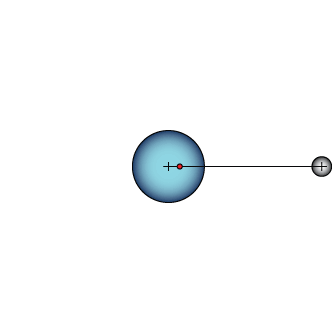 This animation shows how simple orbits work. The dashed circle stays where it was at the beginning to help you see the circular motion of the larger planet. The red dot is the center of mass.