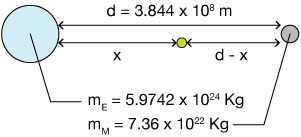$$F_E = \frac{G m \, m_E}{x^2} \phantom{000} F_M = \frac{G m \, m_M}{(d - x)^2},$$
