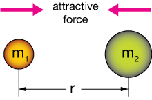 Isaac Newton and others determined, mostly from astronomical data — observations of the motions of planets in the sky — that the gravitational attraction is a property of mass, that it is proportional to the product of the two masses involved, and that it is inversely proportional to the square of the distance between their centers of mass. Here is the definition: