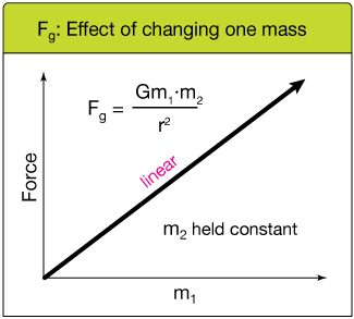 The graph below shows how the force of gravity ($F_g$) varies as one of the masses is increased from zero and the other is held constant. $F_g$ is directly and linearly proportional to each mass — thus the linear graph.