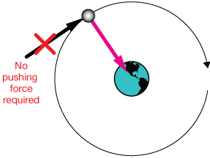 Only a centripetal (center-seeking) force, like gravity, is required to keep bodies in orbit around one another.