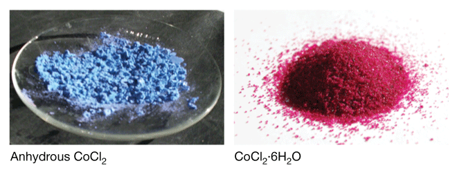 For example, cobalt chloride, CoCl2, can come in two forms. Anhydrous CoCl2 contains no water (an-hydrous literally means "without water"), and is a light blue powder.