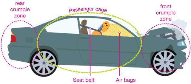 In back and front are "crumple zones," regions of the car that are designed to collapse during a collision, not just transfer energy to the occupants. These zones further lengthen the time it takes to slow down and lose momentum.