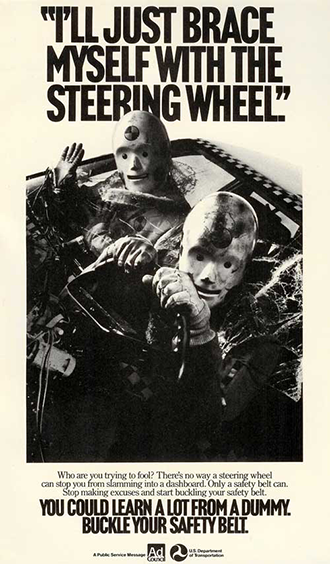 The advertisement on the left was run by the U.S. Department of Transportation to encourage people to use seatbelts, one of many devices now in cars meant to reduce the forces that could kill a person in a car collision.