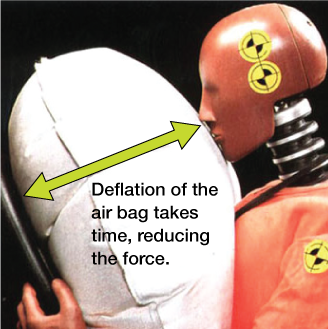 The basic idea is that when a living thing, like a human, a dog, a cat, livestock ... is involved in a collision, its momentum can change dramatically over a very short time. It can go from a very high value to zero very rapidly. Imagine your body traveling at 60 mi./h when your car slams into a big tree. In a tenth of a second or less, your body will go from a very high momentum to zero momentum. Bodies can only take so much force, and it turns out that the shorter the time it takes to reduce your momentum to zero, the larger the force on you. If we can do things to increase the time it takes to undergo that momentum change, the force will be reduced and you might survive.