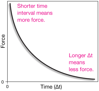 Now this is really a remarkable result. It says that for a given momentum change, or equivalently for a given velocity change of some fixed mass – like a person, the force is inversely proportional to the amount of time it takes to undergo that momentum or velocity change.