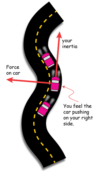 In a left turn you feel like if it weren't for the seat belt and the door itself, you'd go flying right out the passenger side of the car. The illusion is that there is a force pushing you to the right when you're going around a left-hand corner (←) or to the left as you turn to the right.