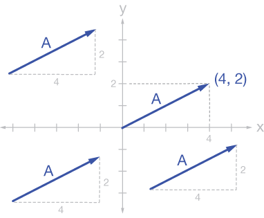 The only two important properties of a vector are its length and its direction. In the graph below, the 2-D vector $\vec{A}$ is written in several locations on the plane. Each version represents the same vector because the length and direction is preserved; its location is irrelevant.