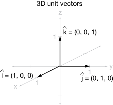 $$ \begin{align} \hat{i} &= (1, 0, 0) \\[5pt] \hat{j} &= (0, 1, 0) \\[5pt] \hat{k} &= (0, 0, 1) \end{align}$$
