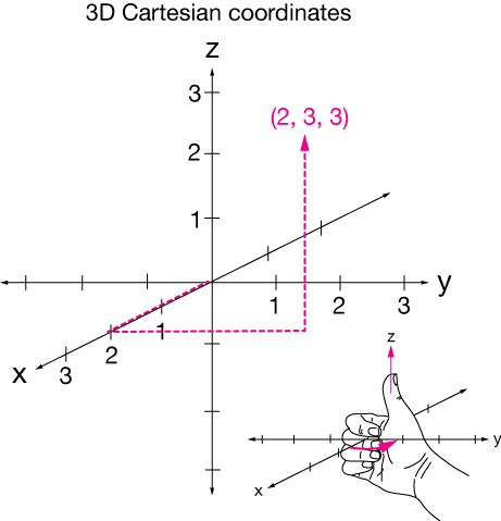 In all of what follows, we'll be using a right-handed 3-dimensional Cartesian coordinate system like the one shown here. "Right-handed" in this sense means that if we trace the direction of the positive end of the $x$-axis as it rotates toward the positive end of the $y$-axis with the fingers of our right hand, our right thumb must point in the positive direction of the $z$-axis. (If you did this with your left hand, $z$ would point downward. The same would be true if you switched the $x$ and $y$ axes and used your right hand.) Take a minute to make sure you can visualize the plotting of points on such a coordinate system. It's not always easy, but the more effort you put into it, the better you'll get at it.