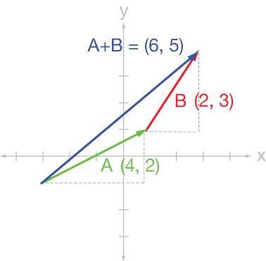 In the graph we add two vectors, $\vec A$ and $\vec B$ graphically. The blue vector is the resultant, the sum of the two. Numerically, we simply add the $x$ and $y$ coordinates to get the coordinates of the sum vector: $(4+2, \; 2+3) = (6, \, 5)$.