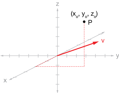 We have a point, $P = (x_o, \; y_o, \; z_o),$ and a direction vector $\vec{v}$ and we will draw the vector $\vec r_o = \langle x_o, \; y_o, \; z_o\rangle$ to point $P$, as shown in the second graph.