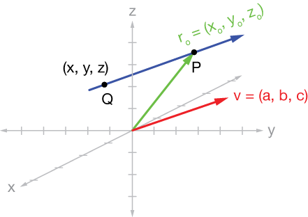 Now because two points define a line, let's imagine a second point $Q = (x, y, z)$ on our line. Then the vector from $Q$ to $P$, $\overrightarrow{QP},$ is
