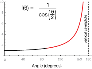 This graph shows that as the angle $\theta$ approaches 180˚ any function inversely proportional to $[\text{cos}(\theta/2)]$ grows infinitely as $\theta \rightarrow \infty$.