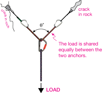 Take a look at the rock climbing example below. When setting up a rock-climbing anchor, one wants always to have some redundancy — more than one anchor, and to share the load (e.g. of a falling person) among two or more anchors (we'll just use two in this analysis).
