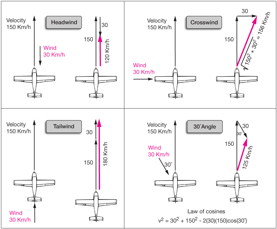A cross wind (coming in at 90˚ to the direction of travel) shifts the course of the plane away from the wind. In the case of wind blowing at an odd angle to the forward velocity vector, use the law of cosines to solve for the resultant velocity vector.