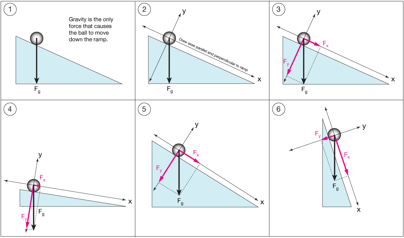 Panels 4, 5 & 6 show ramps of increasing steepness. Notice that the component of Fg pointing down the ramp in each increases with the steepness. The larger force accounts for the fact that the ball will roll faster as the ramp steepens.