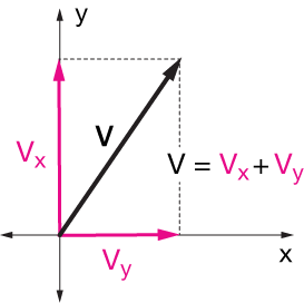 The example at right shows a vector drawn on a Cartesian plane. By drawing the dashed lines from the tip of the vector to the axes, at right angles, we come up with the vectors $\vec V_x$ and $\vec V_y$, which sum to vector $\vec V$.