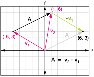 A = (-2, 3) - (1, 1) = (-3, 2), where the start coordinate just turns into the origin: (1, 1) - (1, 1) = (0, 0).