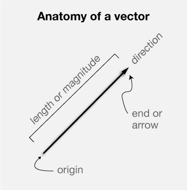 A vector is a directed line segment. It is drawn as an arrow (see gray panel), and has only two important aspects, its length and its direction.
