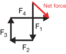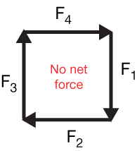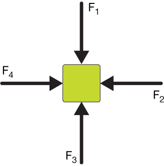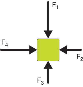Forces are represented graphically and mathematically by vectors. Recall that many forces may come to bear on an object, but unless those forces are "unbalanced" in some way, they will add to zero — no net force. The diagram below shows four equivalent and balanced forces acting on an object.