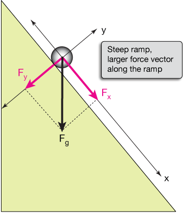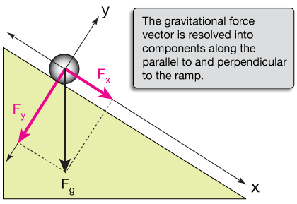 Consider a ball rolling down a ramp like the one below. We almost always change our coordinate system from one in which the $x$-axis is parallel to level ground to one in which it parallels the ramp. It's much more convenient that way, and nature doesn't really care about our coordinate system anyway. We can then resolve the gravitational force vector, $F_g$ into components parallel to our new axes: