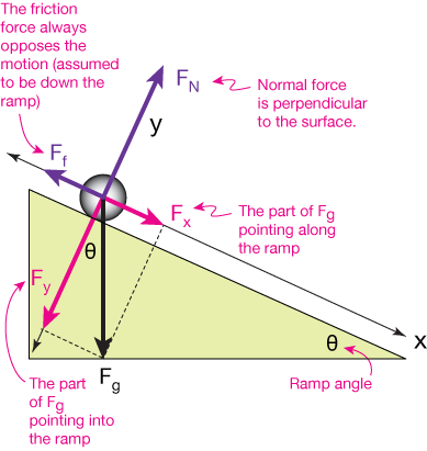 We can do better at listing the forces in such a diagram. The force pointing into the ramp, $F_y$ is countered by the normal force, the force of the ramp pushing back on the ball. Likewise, the force pushing the ball down the ramp is countered by some frictional force, $F_f$.
