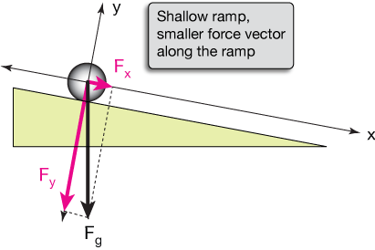 The two ramps below illustrate why the acceleration of a rolling ball is greater down a steeper ramp: The component of the gravitational force, the only force present that makes the ball roll, is greater down the ramp when the ramp is steeper.