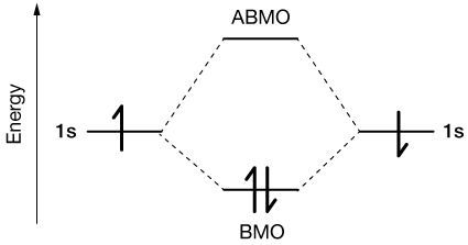 Each of the 1s orbitals of the H atoms has mixed into two molecular orbitals. One is of lower energy than the individual 1s energy levels and is called the bonding molecular orbital (BMO). The other is of higher energy. If either of the electrons in a bonding MO are excited into it (the anti-bonding MO, ABMO), the molecule flies apart into two atoms once again. The energy spacings here are just schematic, but the idea is the same for any bond. You can look at it like a conservation of orbitals. N atomic orbitals will always combine into N molecular orbitals, some bonding and some anti-bonding.