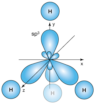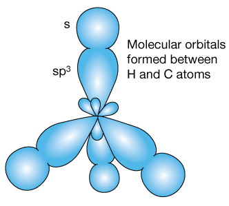 Now those four electrons are in different kinds of orbitals (s and p), but we know from experiments that the four C–H bonds of CH4 are equivalent. It turns out that nature creates hybrid orbitals, consisting of three 2p orbitals and one 2s orbital, called sp3 orbitals (one part s, three parts p)