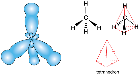 Valence shell electron-pair repulsion (VSEPR) theory predicts that the four main lobes of each of the four hybrid orbitals will move as far from one another as possible. That means they'll assume the tetrahedral arrangement shown above. Ultimately, this leads to the tetrahedral structure of CH4, and to the fact that most carbon "centers" in organic (carbon containing) molecules are tetrahedral.