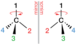 One of the most interesting implications of this embedded tetrahedral structure in carbon-containing molecules is that of chirality, or handedness. We can, in fact, have right-handed and left-handed molecules. Take a look at the two chiral centers below. They are mirror images of each other. From the point of view of the ligand labeled "1" in each, counting around ligands 2, 3 and 4 produces a clockwise circle on the left and a counterclockwise circle on the right. This actually has a huge effect on the chemistry of carbon, including all of biochemistry – but it's a subject for another section.