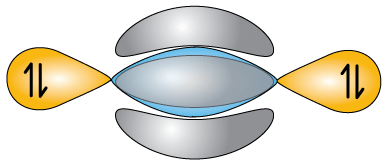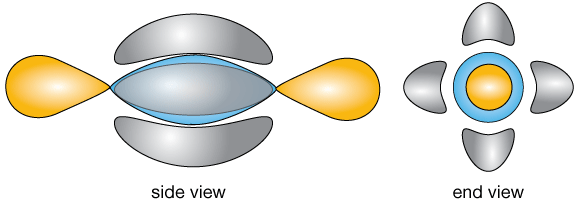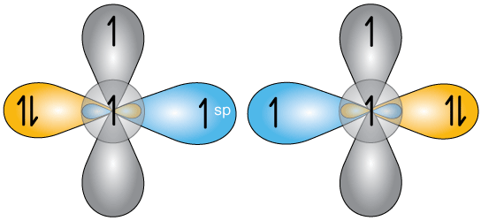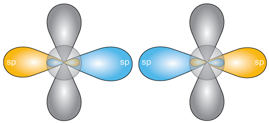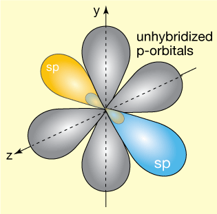 The resulting orbital arrangement looks like this. Two sp hybrid orbitals (yellow and blue in the figure) are orthogonal (perpendicular in both y & z directions, as shown) to two non-hybridized p-orbitals, each containing one electron.