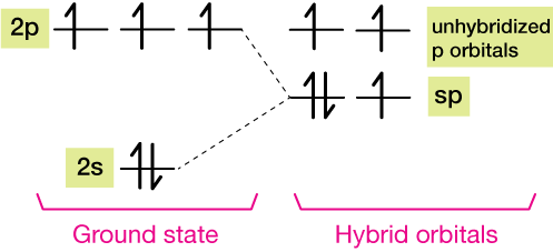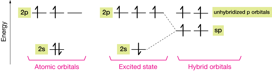 Notice that in this case, hybridization first requires excitation of one electron (up and down arrows in the figure) from the s-orbital to a p-orbital first.