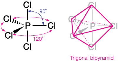 The molecule PCl5 looks like this. A trigonal bipyramid consists of two back-to-back three-sided pyramids.