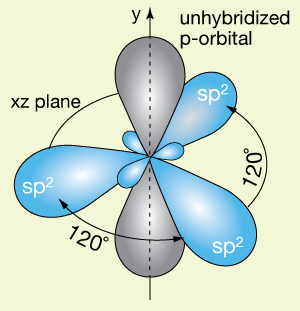 The resulting sp2 orbitals arrange themselves around the 2p orbital as shown below, with 120˚ bond angles between each, all lying in a plane perpendicular to the unhybridized p-orbital.