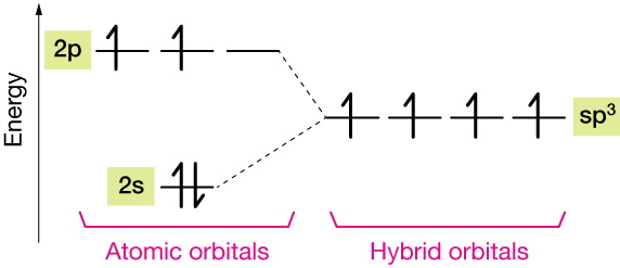 The diagram below shows how it works. After hybridization, all four valence electrons of the carbon atom occupy equivalent sp3 hybrid orbitals, ready to bond to four hydrogen atoms.