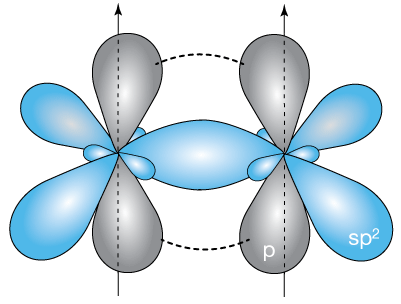 Overlap of two of the sp2 orbitals, one from each atom, forms part of the bond. The other part comes from an interaction of the electrons in the unhybridized p-orbitals. As these are drawn nearer to each other, the molecular orbitals that form above and below the central sp2-sp2 bond create the rest of the π-bond.