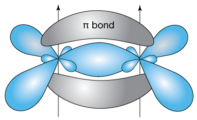 A more realistic impression of the orbitals of the full π-bond is shown below. This bonding arrangement, involving four total electrons, causes the molecule to be planar and rigid, with the C=C π-bond shorter than a C–C single (or sigma, σ) bond.