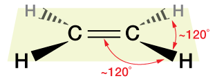 If we add four hydrogen atoms to each of the non-bonded sp2 orbitals still unoccupied in the drawing above, we get ethylene. Here is a simplified drawing of ethylene, C2H4, which has a C=C double bond with four hydrogen atoms bound to the other unpaired electrons (in sp2 hybrid orbitals) of the carbon atoms. Ethylene is a planar molecule.