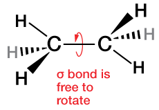 The C=C bond of ethylene, because of the way the molecular orbitals that form it are arranged, is stiff and does not rotate about the C=C axis. Thus ethylene is a fairly rigid planar molecule. Contrast that to ethane, C2H6, below, which has only sp3 hybridization and σ bonds.