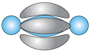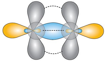 The figure below shows two hybridized nitrogen atoms lined up for bond formation. As in the last section, two of the unhybridized orbitals are meant to be poking into and out of the screen (gray circles in the middle).