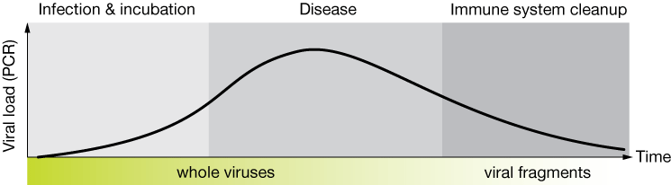 The problem is that what we measure over the course of an infection can change. In the early stages of an infection, we often observer some "incubation phase," during which a few viruses are multiplying and getting the infection going, a disease phase during which many of the signs and symptoms of the disease might be manifested by the host, and a phase during which the adaptive immune system has got the upper hand in reducing the viral load.